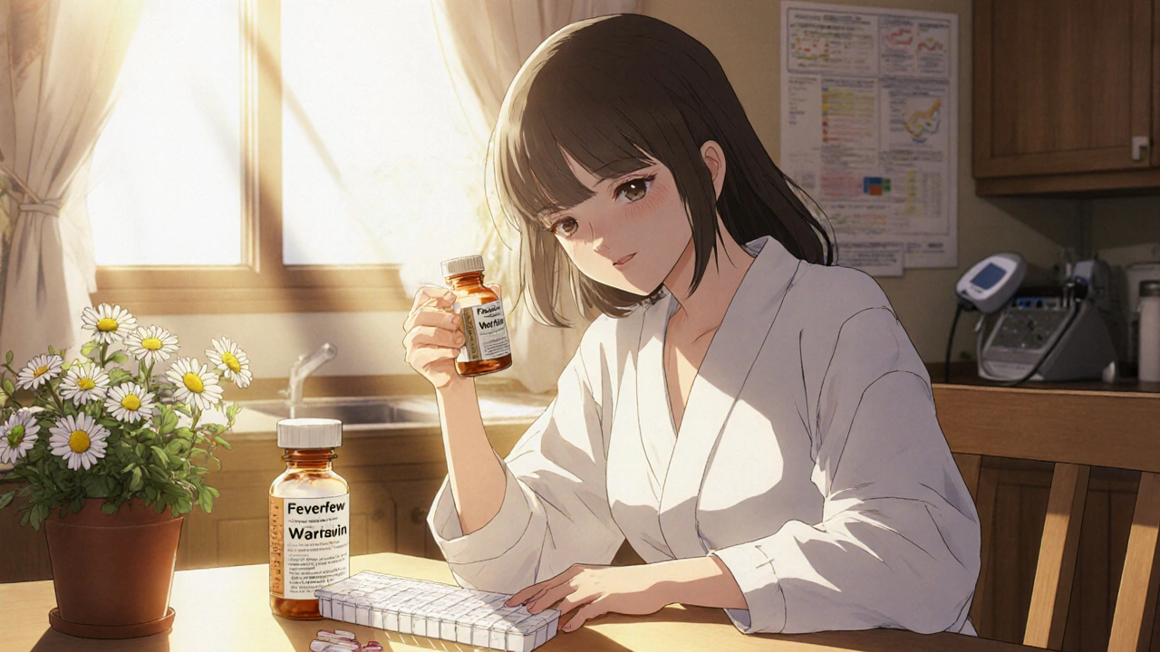 When you're managing a chronic condition like atrial fibrillation or deep vein thrombosis, every pill matters. You track your warfarin dose, avoid vitamin K-rich foods, and check in with your doctor regularly. But what about that bottle of feverfew tucked in your medicine cabinet? It’s labeled "natural migraine relief"-so it must be safe, right? Not necessarily. Feverfew, a herb used for centuries to ease headaches and inflammation, can quietly interfere with blood thinners and raise your risk of dangerous bleeding-even if you feel fine.